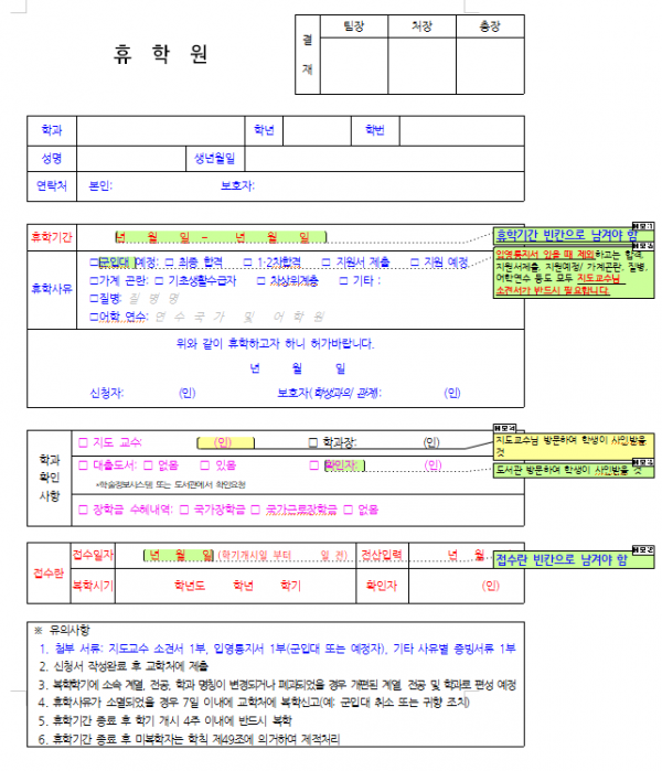 - 휴학원에 있는 휴학기간, 접수란 작성 금지(교학처에서 작성)