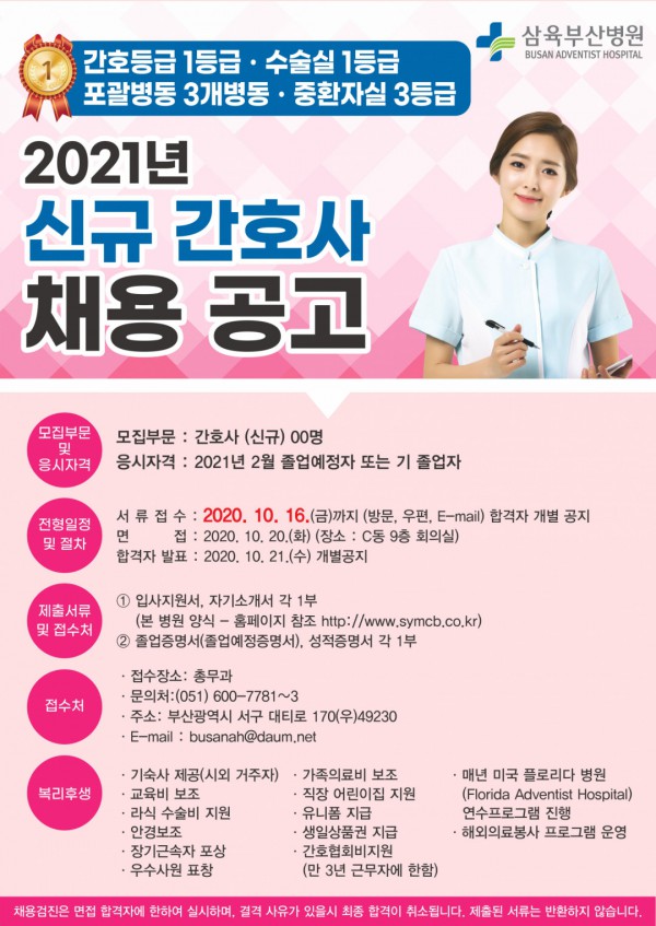 <삼육부산병원> 2021년도 신규간호사 채용 공고