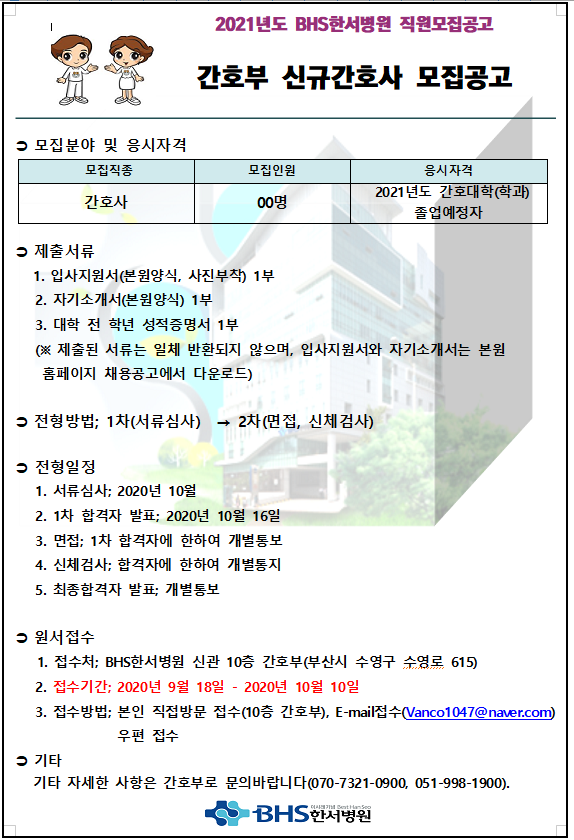 <BHS 한서병원> 2021년도 신규간호사 채용 공고