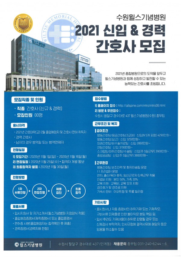 <윌스기념병원> 2021년도 신규간호사 채용 공고