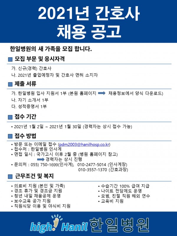 <진주한일병원> 2021년도 신규간호사 채용 공고
