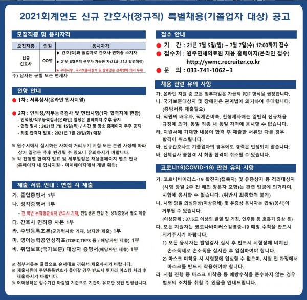 <연세대학교 원주세브란스 기독병원> 2021년도 신규간호사 채용 공고