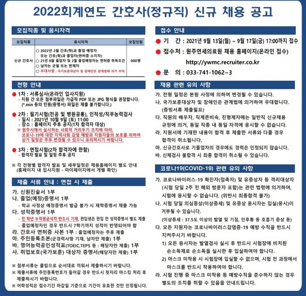 <연세 원주세브란스 병원> 2022년도 신규간호사 채용 공고