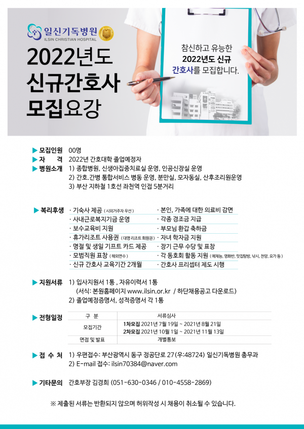 <일신기독병원> 2022년도 신규간호사 채용 공고