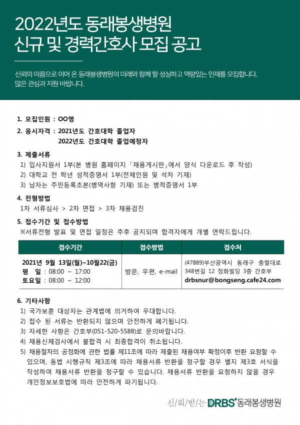 <동래봉새병원> 2022년도 신규간호사 채용 공고