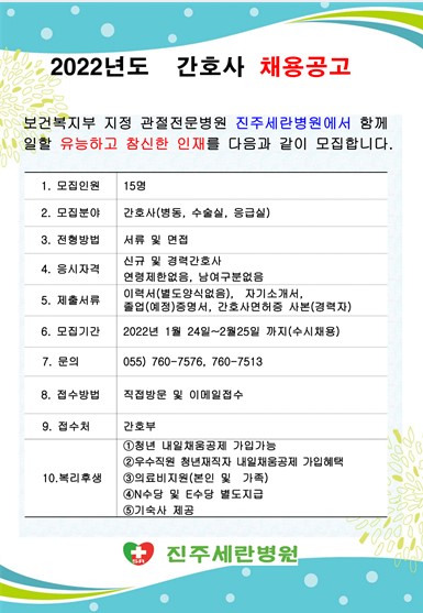 <진주 세란병원>2022년 신규 간호사 채용공고