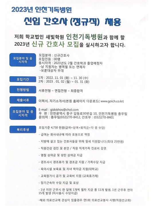 <인천기병원> 신규간호사 모집 안내