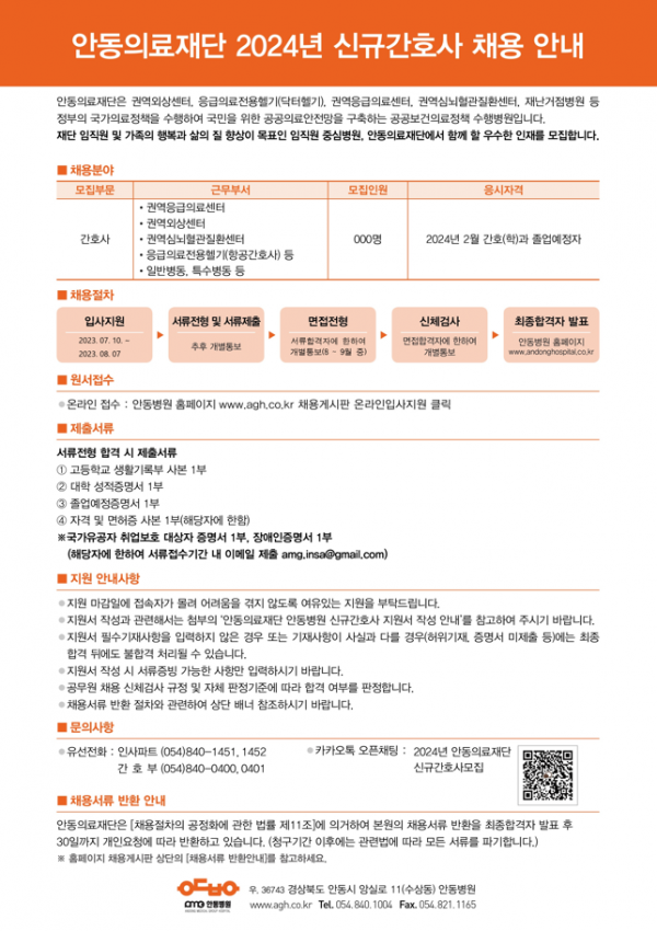 <안동의료재단> 2024년도 신규 간호사 채용 공고
