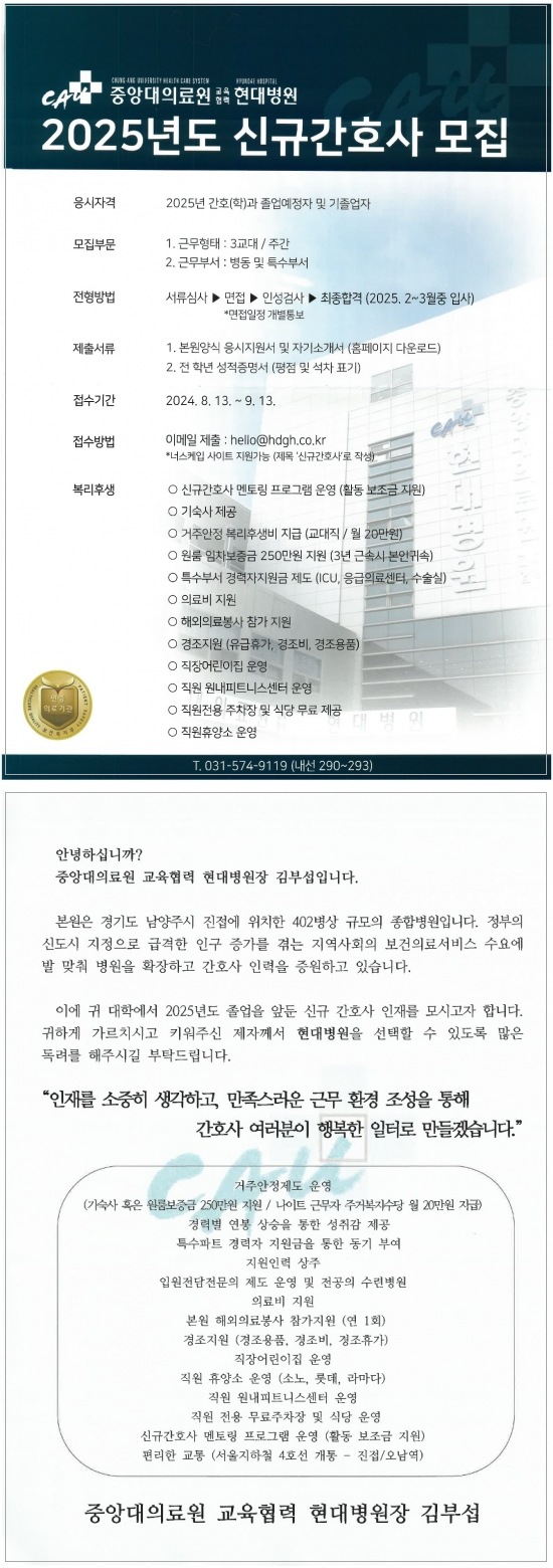 <중앙대의료원교육협력현대병원> 2025년도 신규 간호사 채용 공고