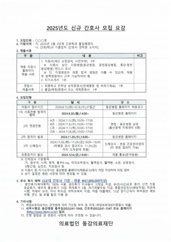 <동가의료재단> 2025년도 신규 간호사 모집 요강