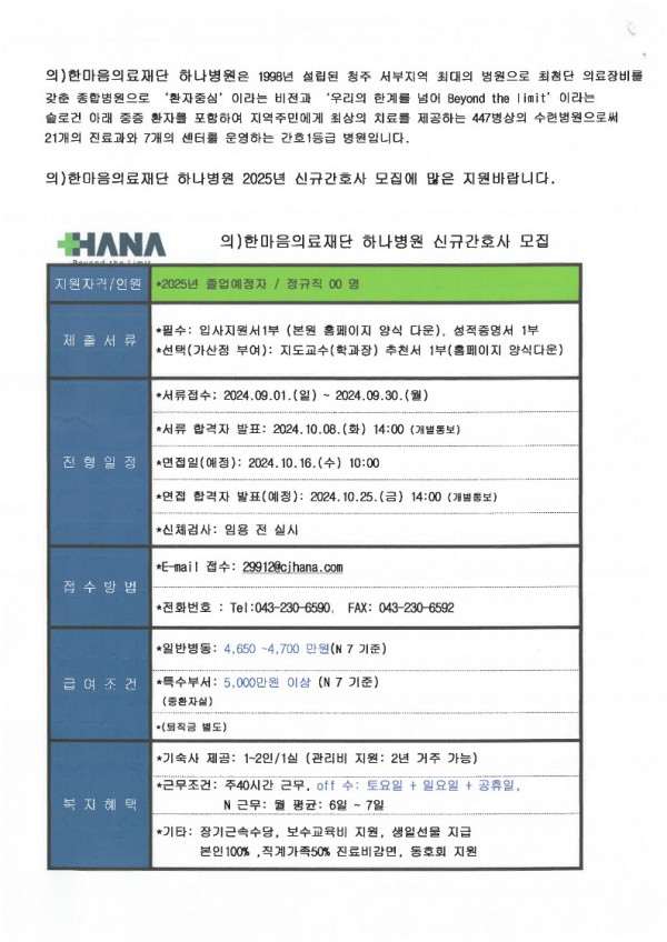 <하나병원> 2025년도 신규 간호사 채용 공고