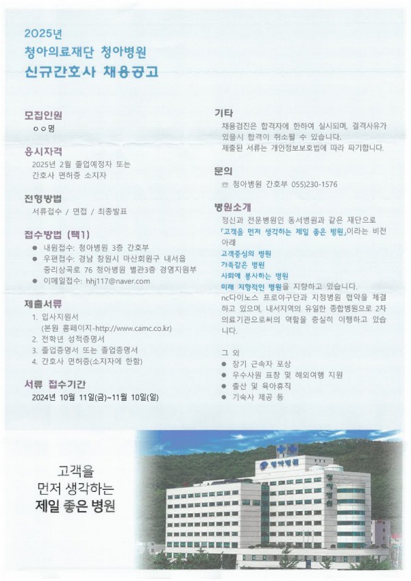 <청아의료재단 청아병원> 2025년도 신규 간호사 채용공고