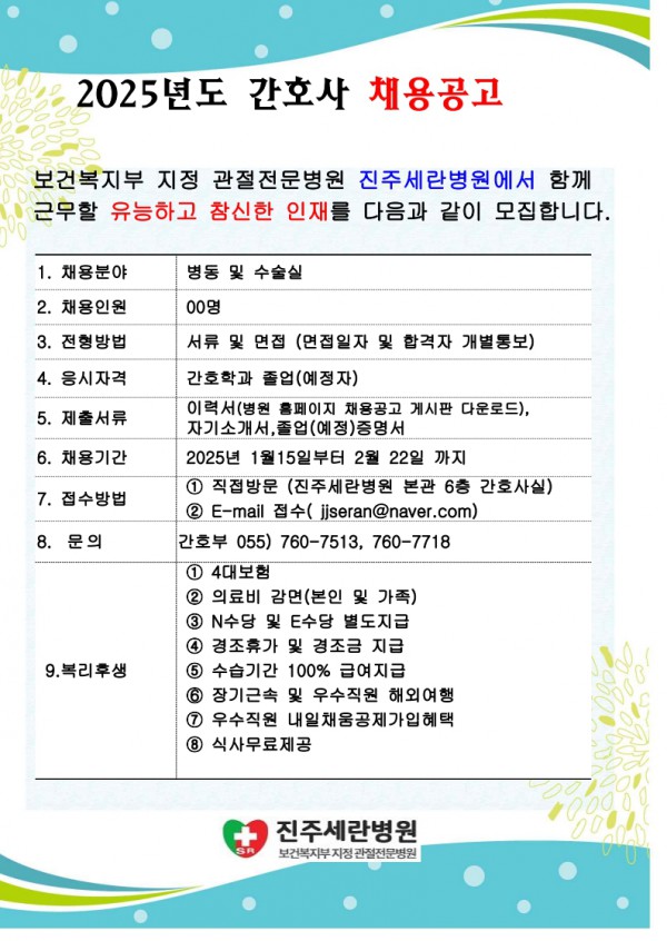 <진주세란병원> 2025년도 간호사 채용공고