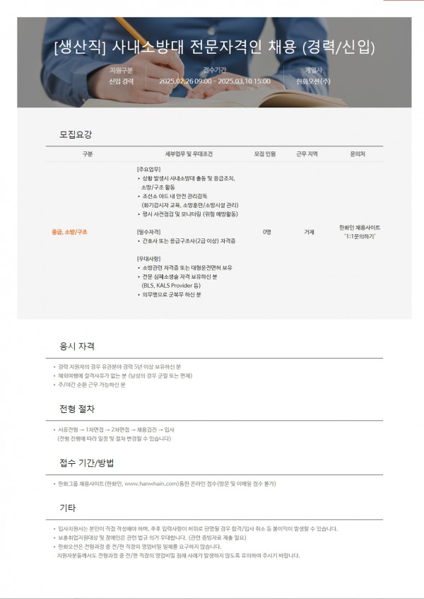 ※채용공고문 링크: https://www.hanwhain.com/ - 접수기간: 2025.02.26.(수) ~ 2025.03.10.(월) 15시 - 필수자격: 간호사 또는 응급구조사(2급 이상) |