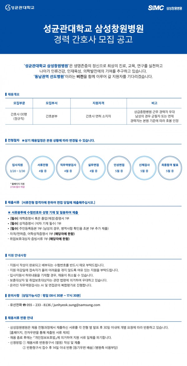 문의사항 : 삼성창원병원 인사지원팀 (전화 : 055-233-8136 / 메일 : junhyeok@samsung.com)