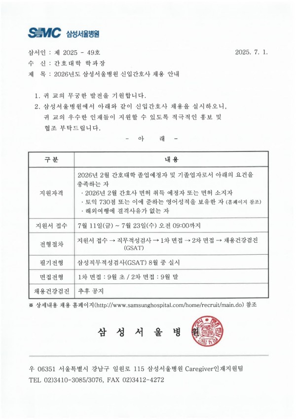 <삼성서울병원> 신규간호사 채용공고