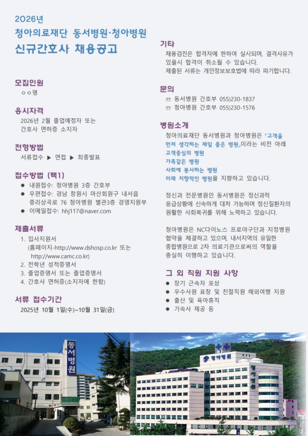 <청아의료재단 동서병원, 청아병원> 2026년도 신규간호사 채용공고