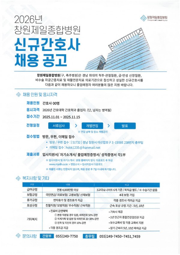 <창원제일종합병원>2026년 신규간호사 채용 공고