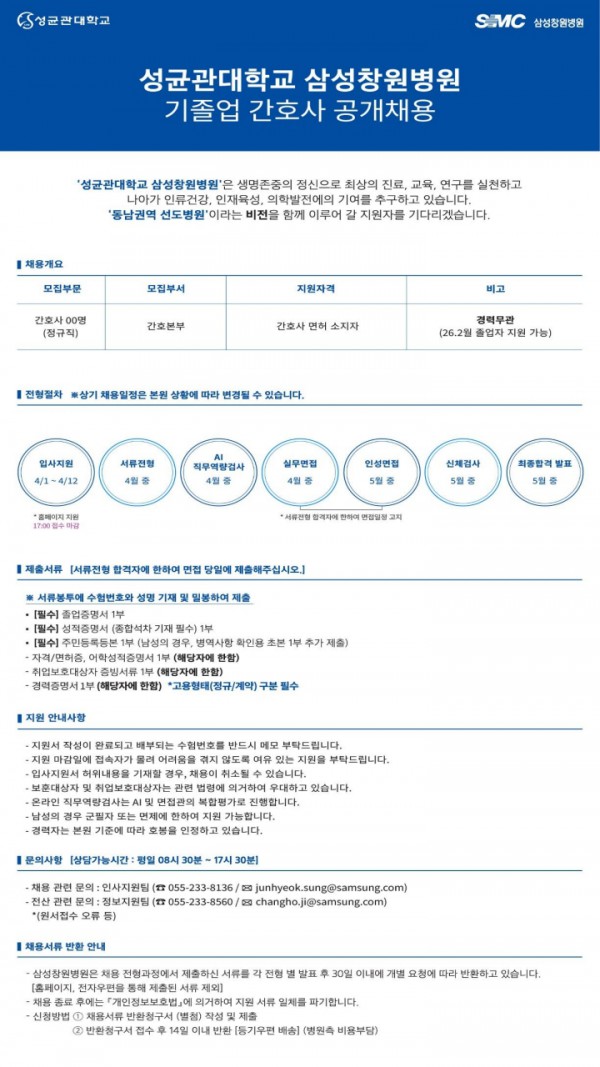 <성균관대학교 삼성창원병원> 기졸업자 간호사 채용